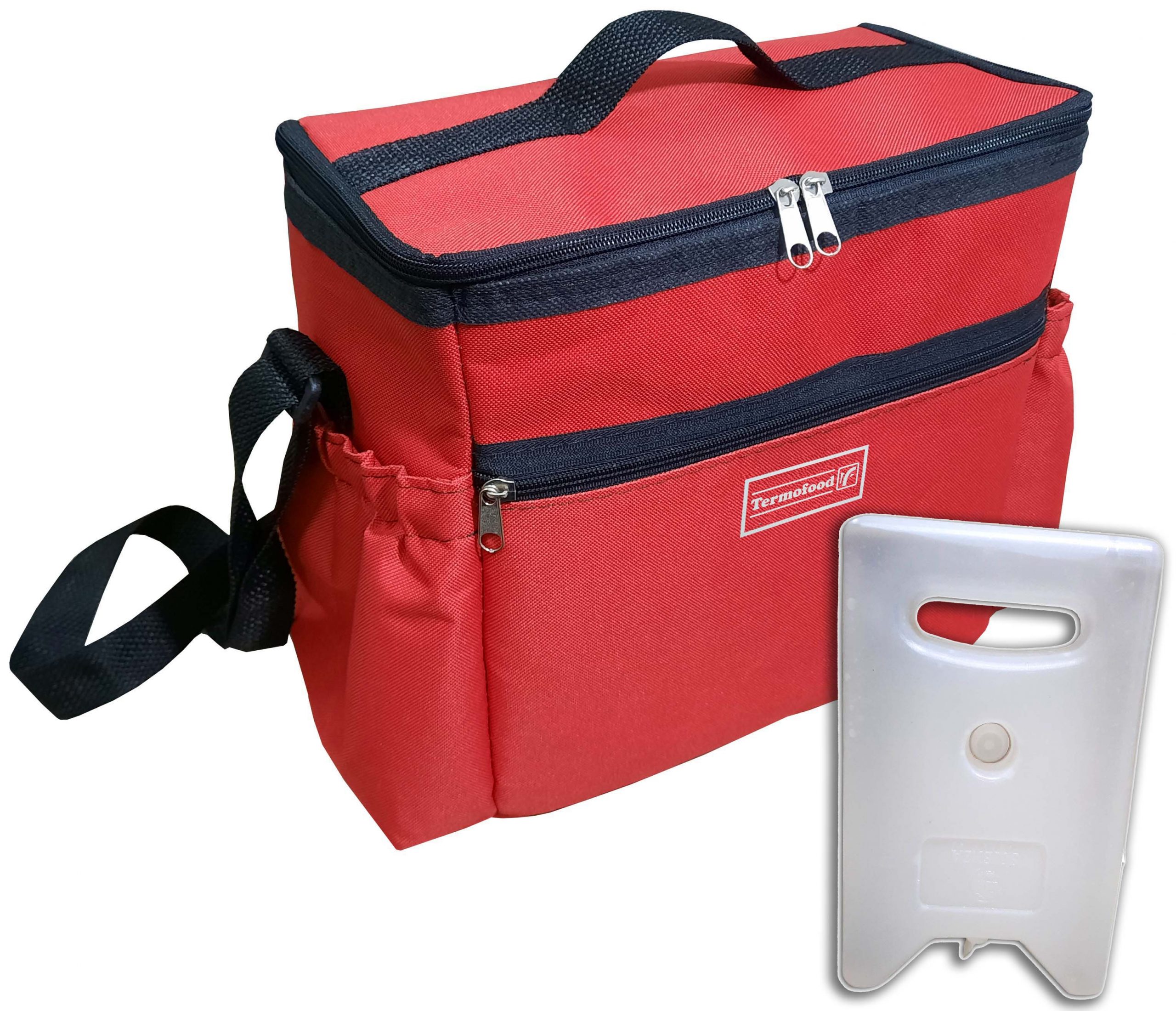 - 12-liter capacity thermal-insulated satchel with two elastic side pockets and front pocket, top handle on the lid and adjustable strap, side-to-side zipper. Size 27 x 18 x 25 cm.