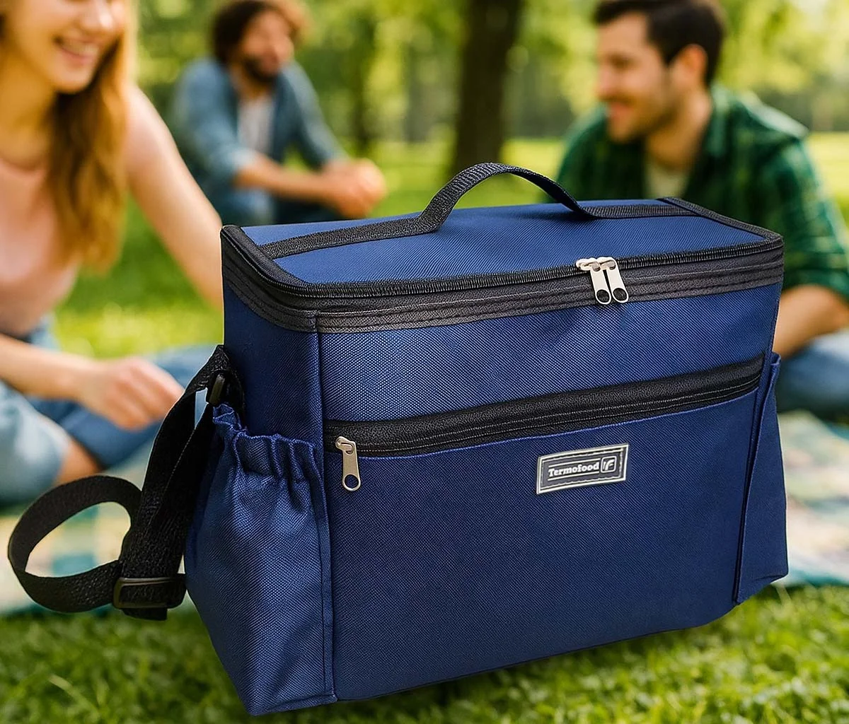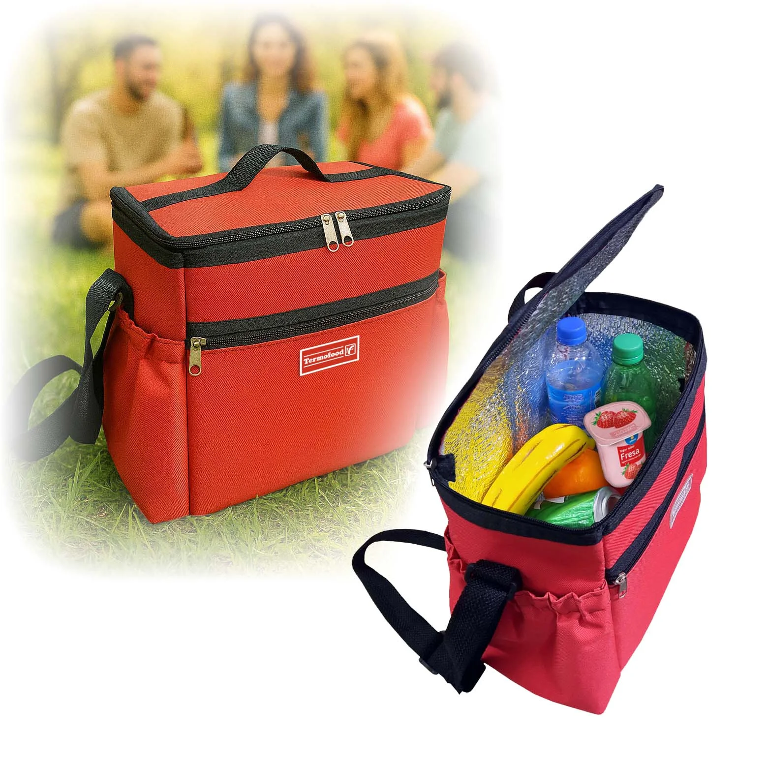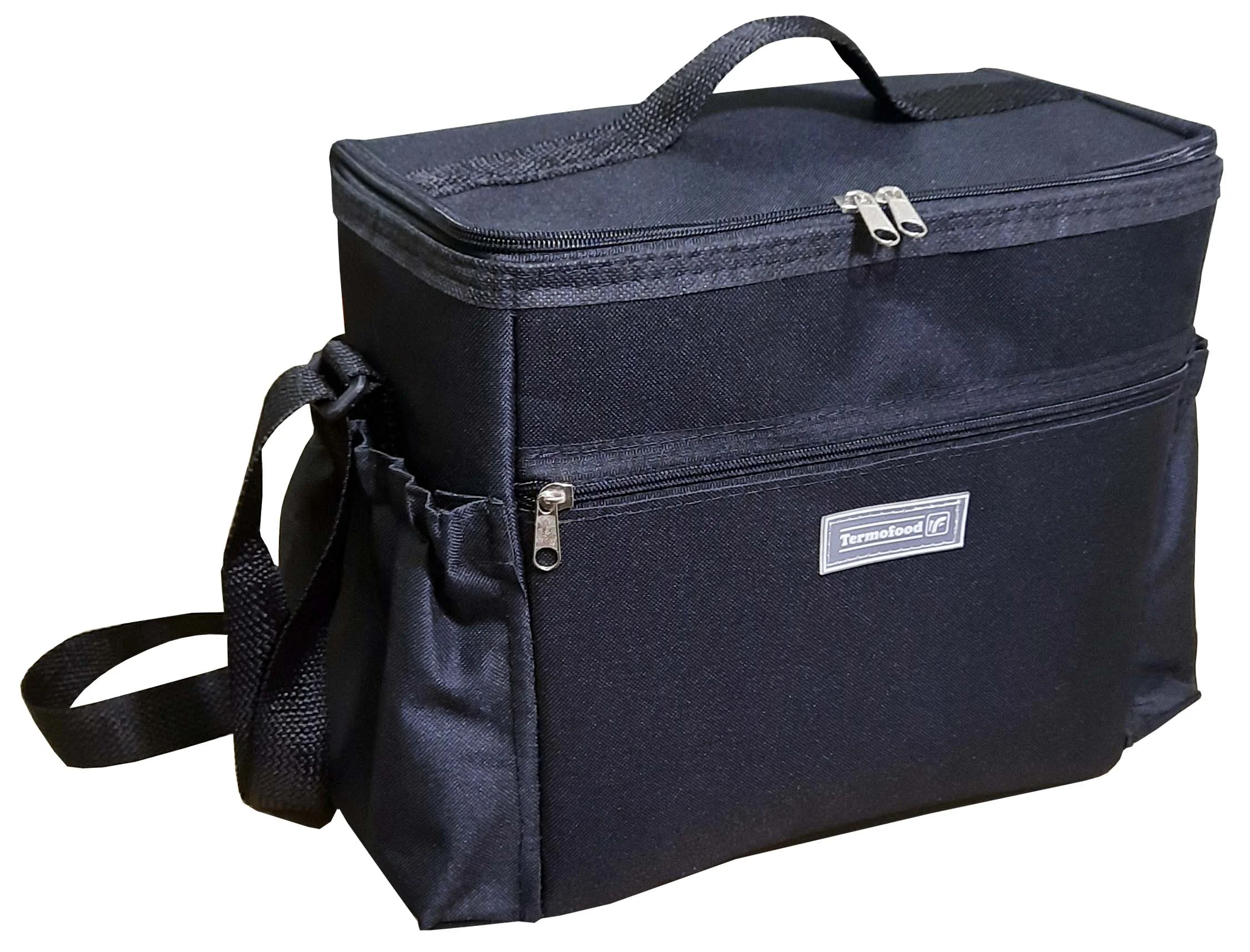12-liter capacity thermal-insulated satchel with two elastic side pockets and front pocket, top handle on the lid and adjustable strap, side-to-side zipper. Size 27 x 18 x 25 cm.
