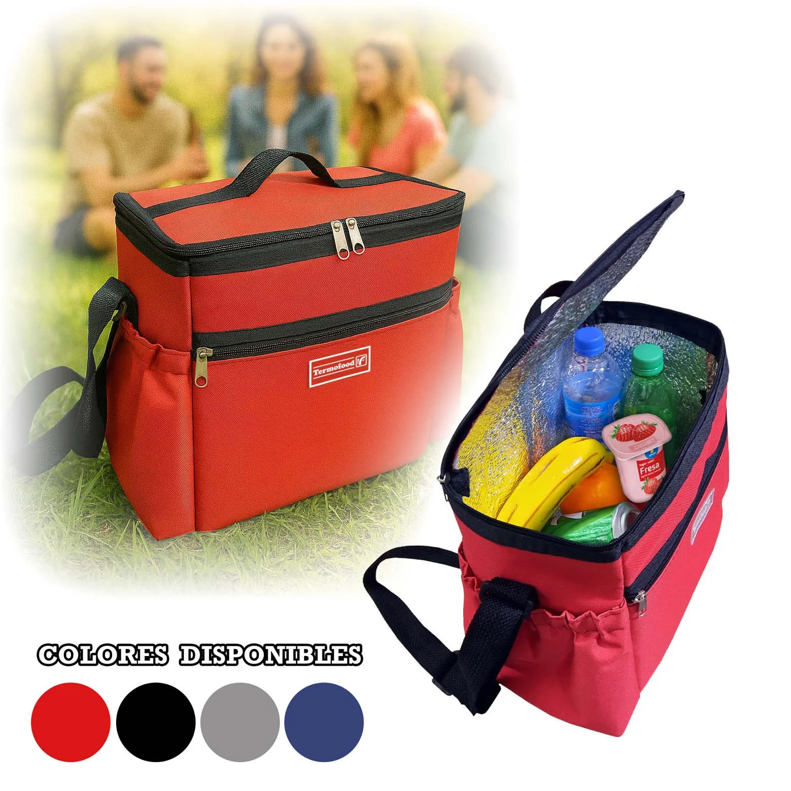LUNCHERA CAPACIDAD 12 LTS. MEDS. 25 X 19 X 25, CON BOLSILLO FRONTAL Y GUANTERAS ELASTIZADAS LATERALES, MANIJA Y CORREA REGULABLE TIPO MORRAL
