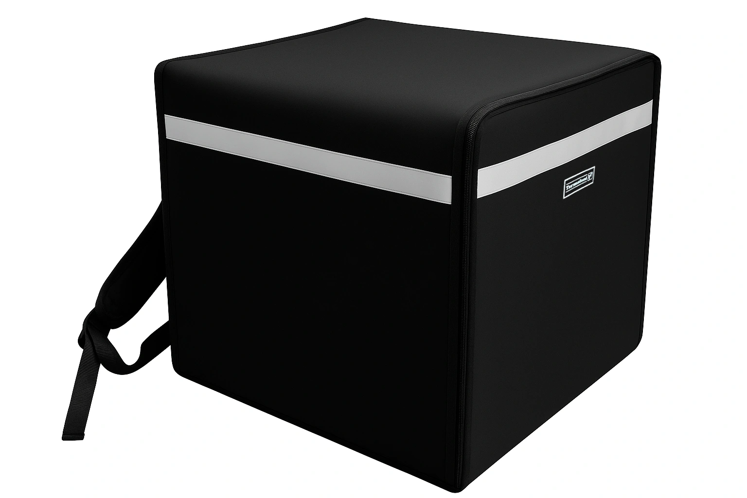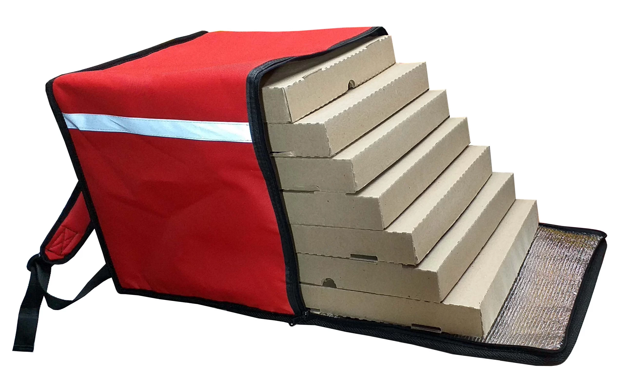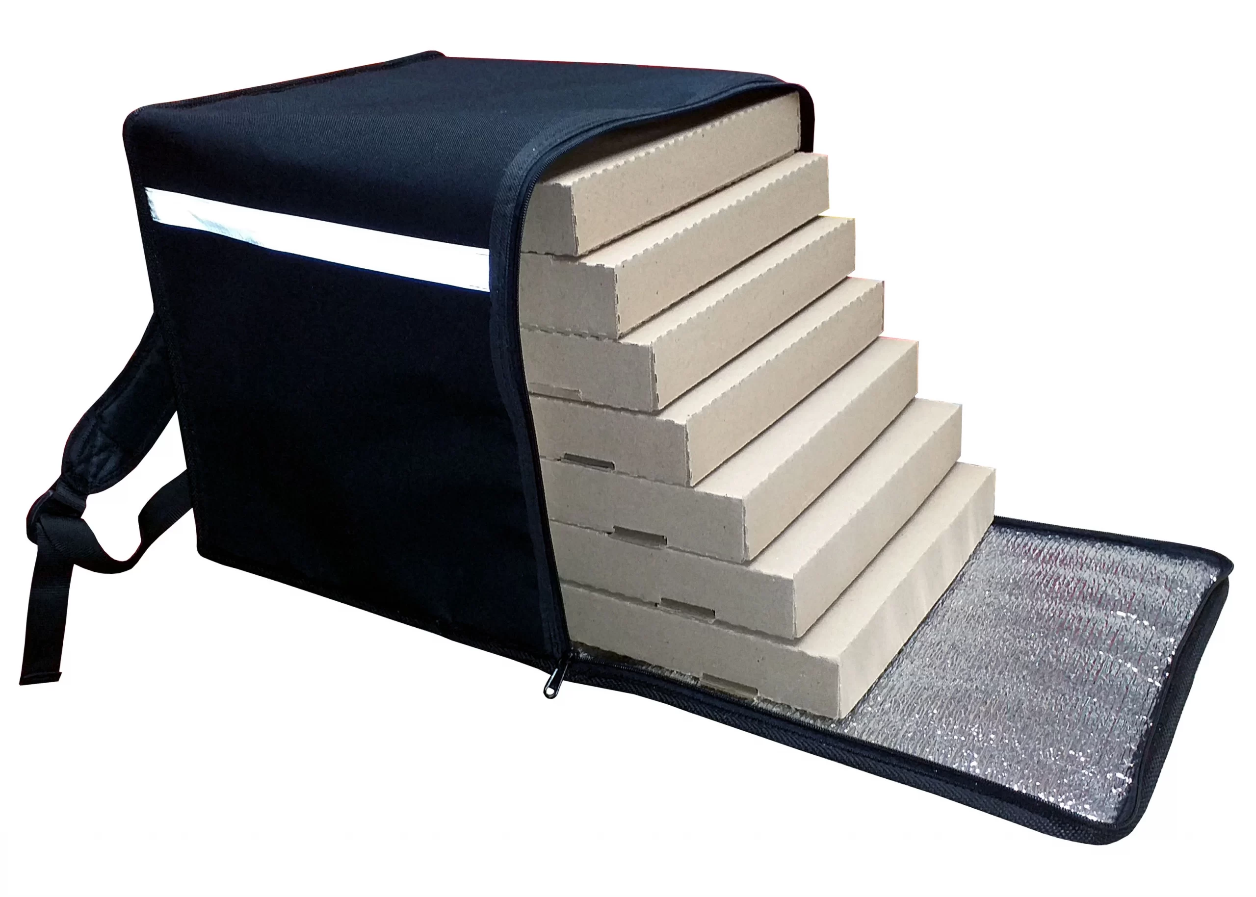 MOCHILA DELIVERY CLASICA DE ABERTURA FRONTAL, REFUERZOS RIGIDOS EN BASE Y ESPALDAR, CAPACIDAD 7 CAJAS DE PIZZA, MEDS. 37 X 37 X 38