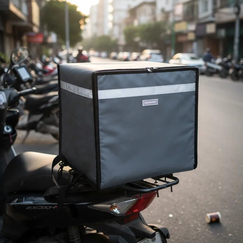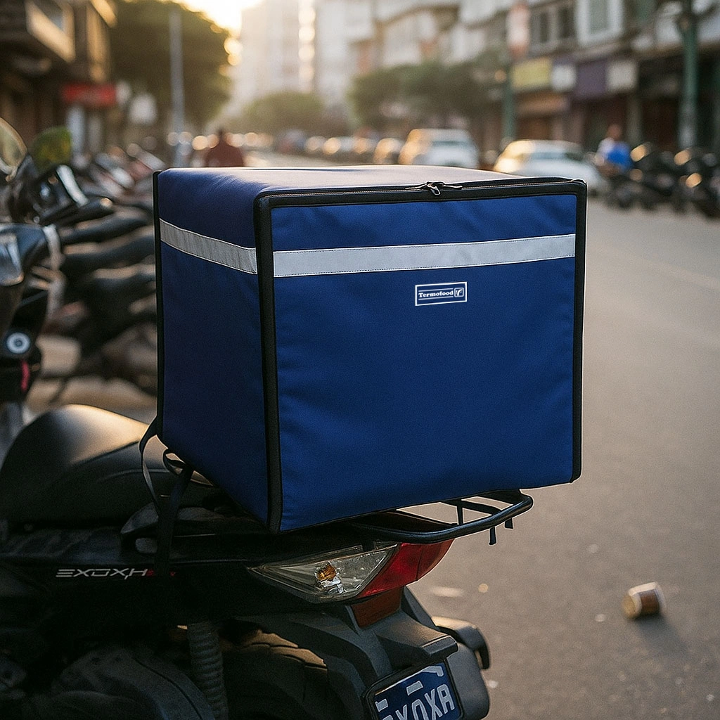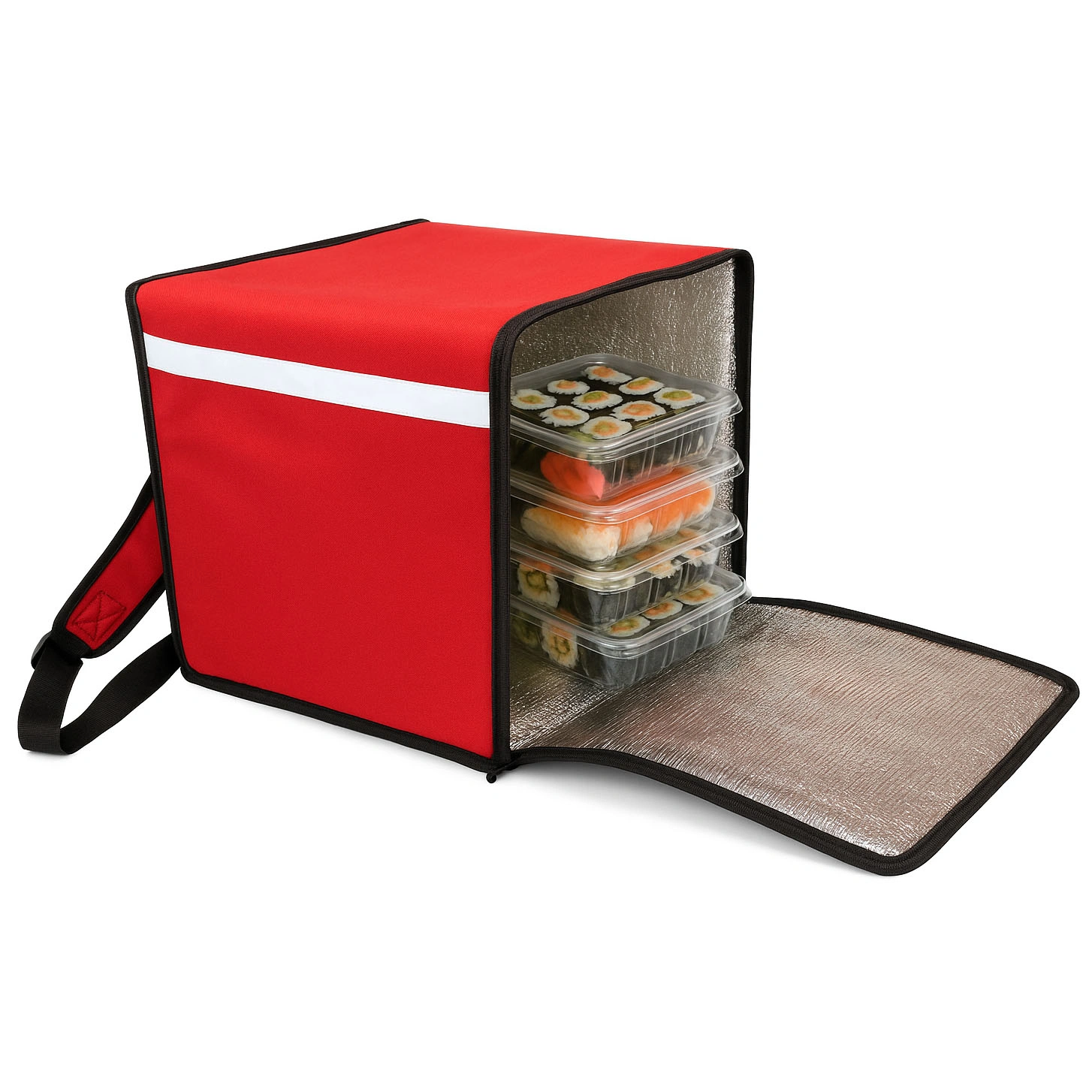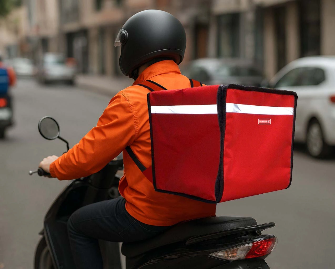 MOCHILA DELIVERY CLASICA DE ABERTURA FRONTAL, REFUERZOS RIGIDOS EN BASE Y ESPALDAR, CAPACIDAD 7 CAJAS DE PIZZA, MEDS. 37 X 37 X 38