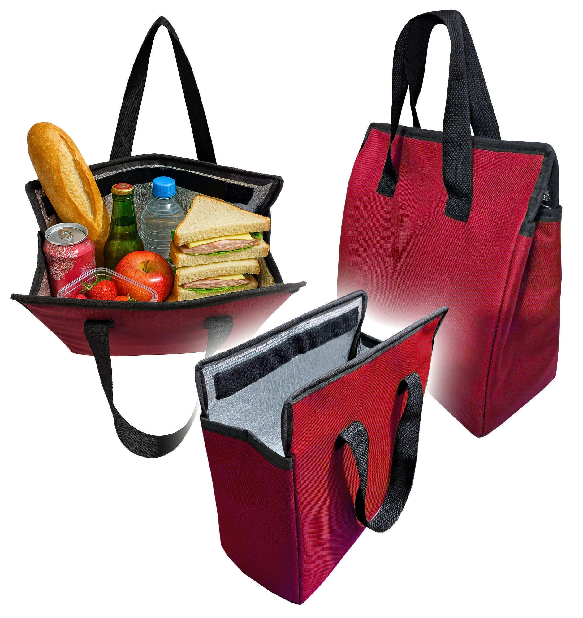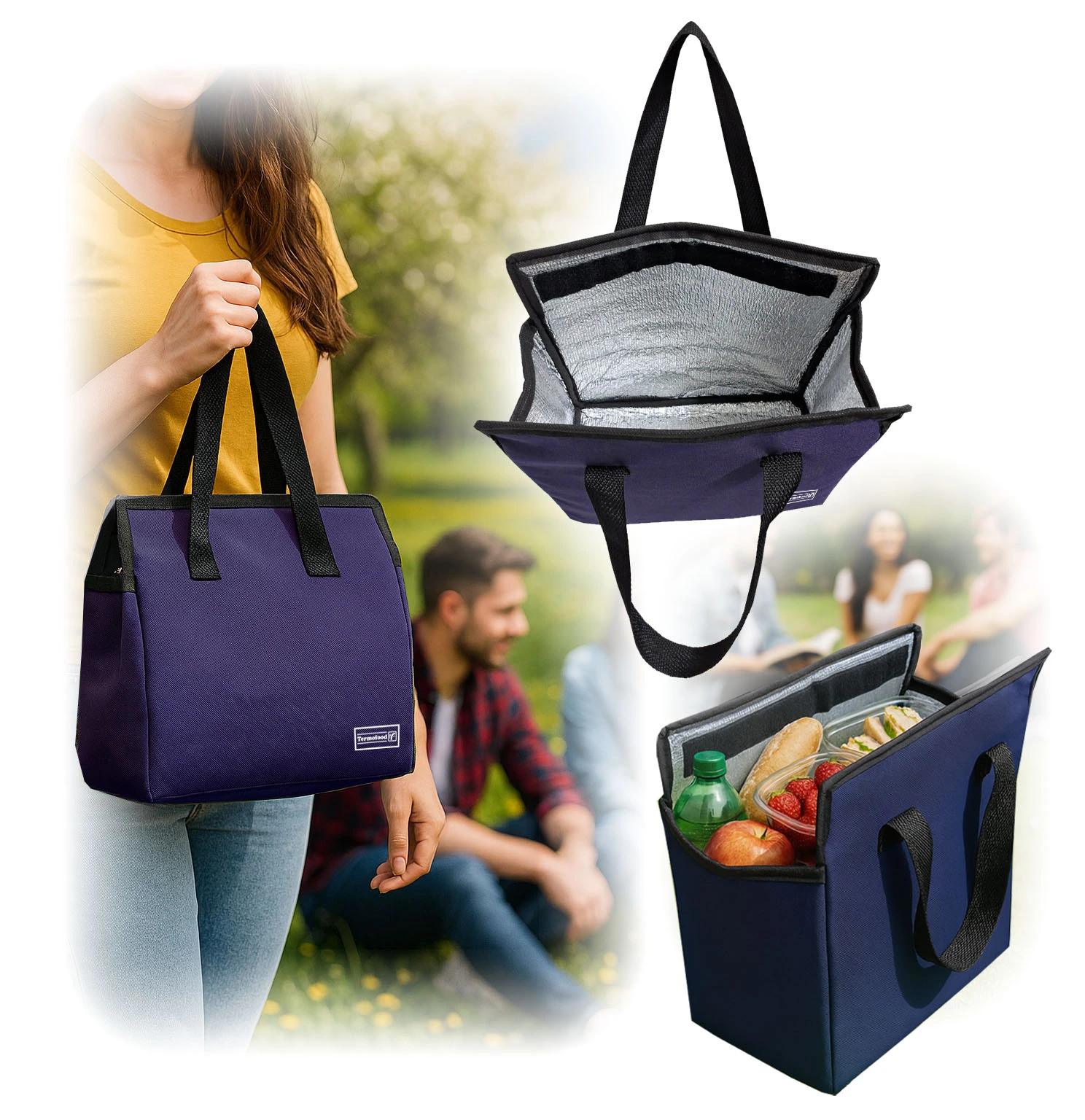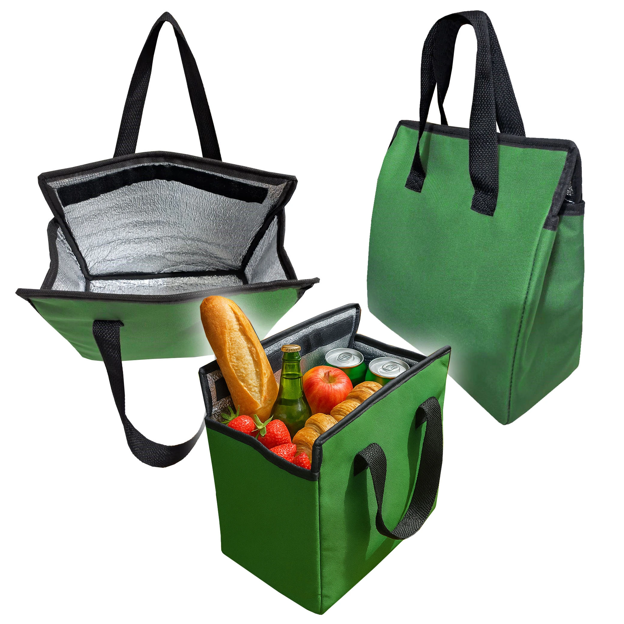 Bolsa conservadora térmica para compras o para viandas, medidas 28 x 13 x 28, cerrado con Velcro, manijas superiores, interior revestido en material térmico aluminizado de 5 mm de grosor.