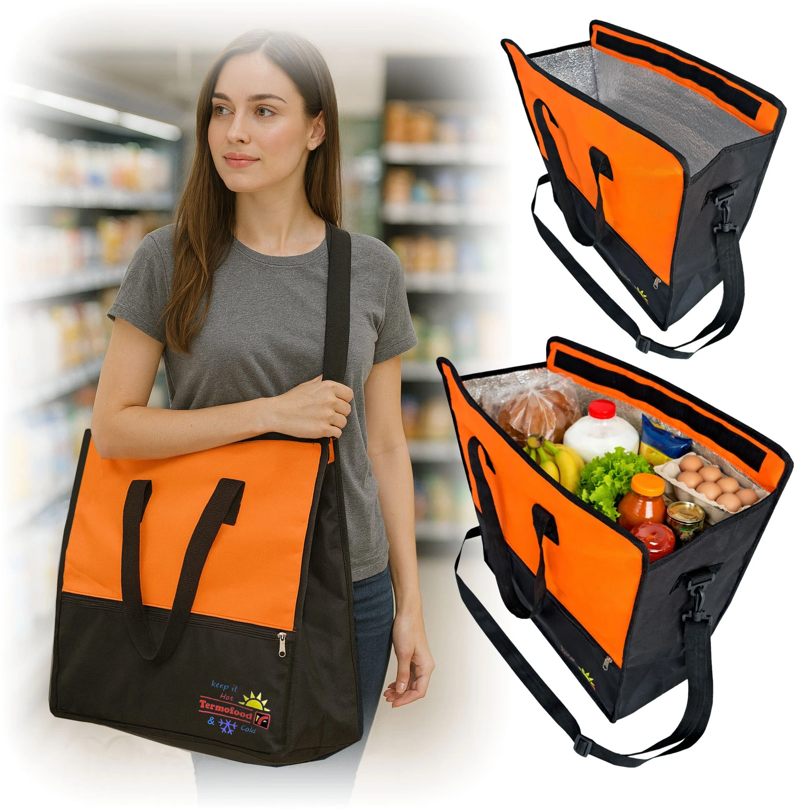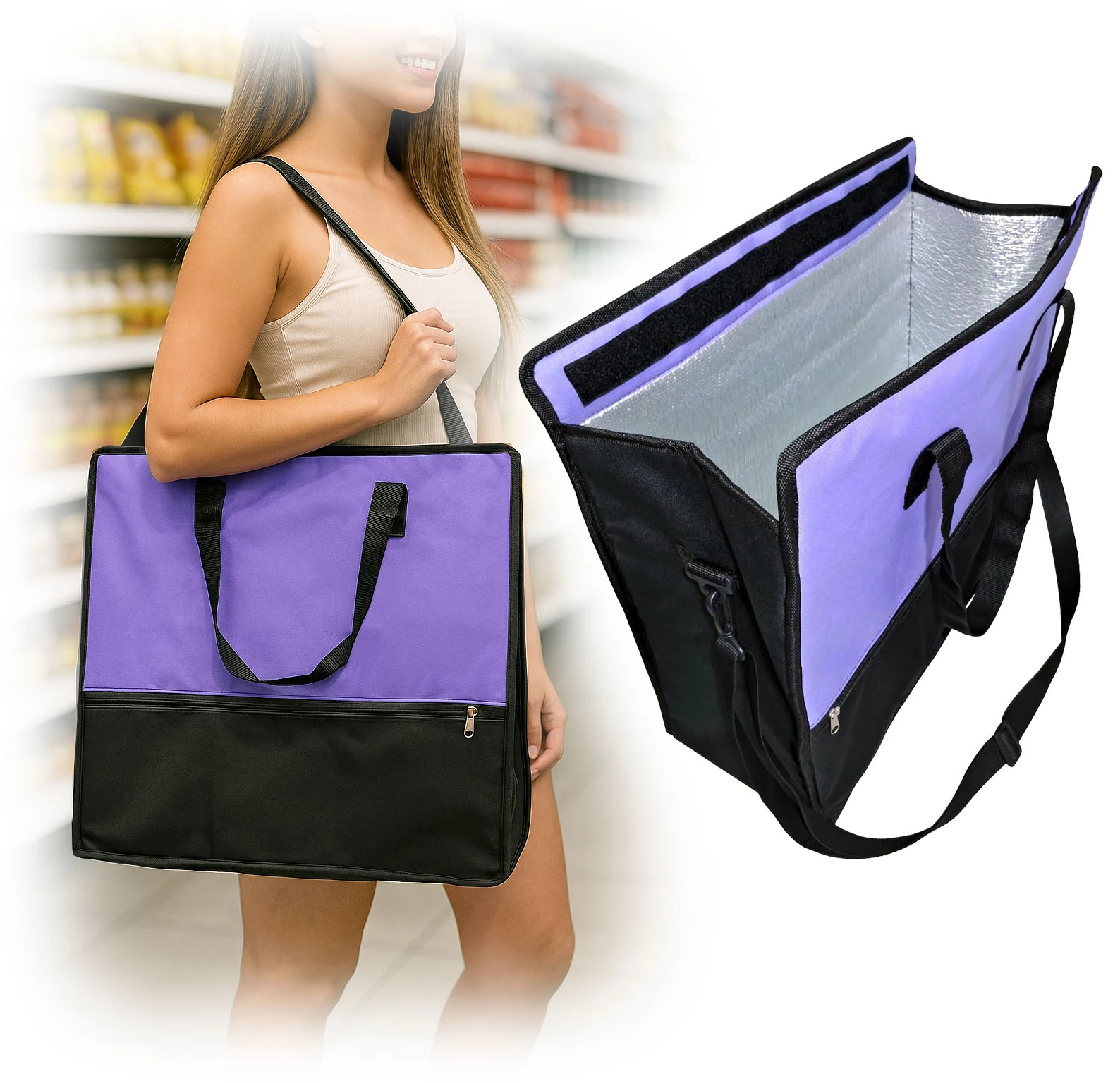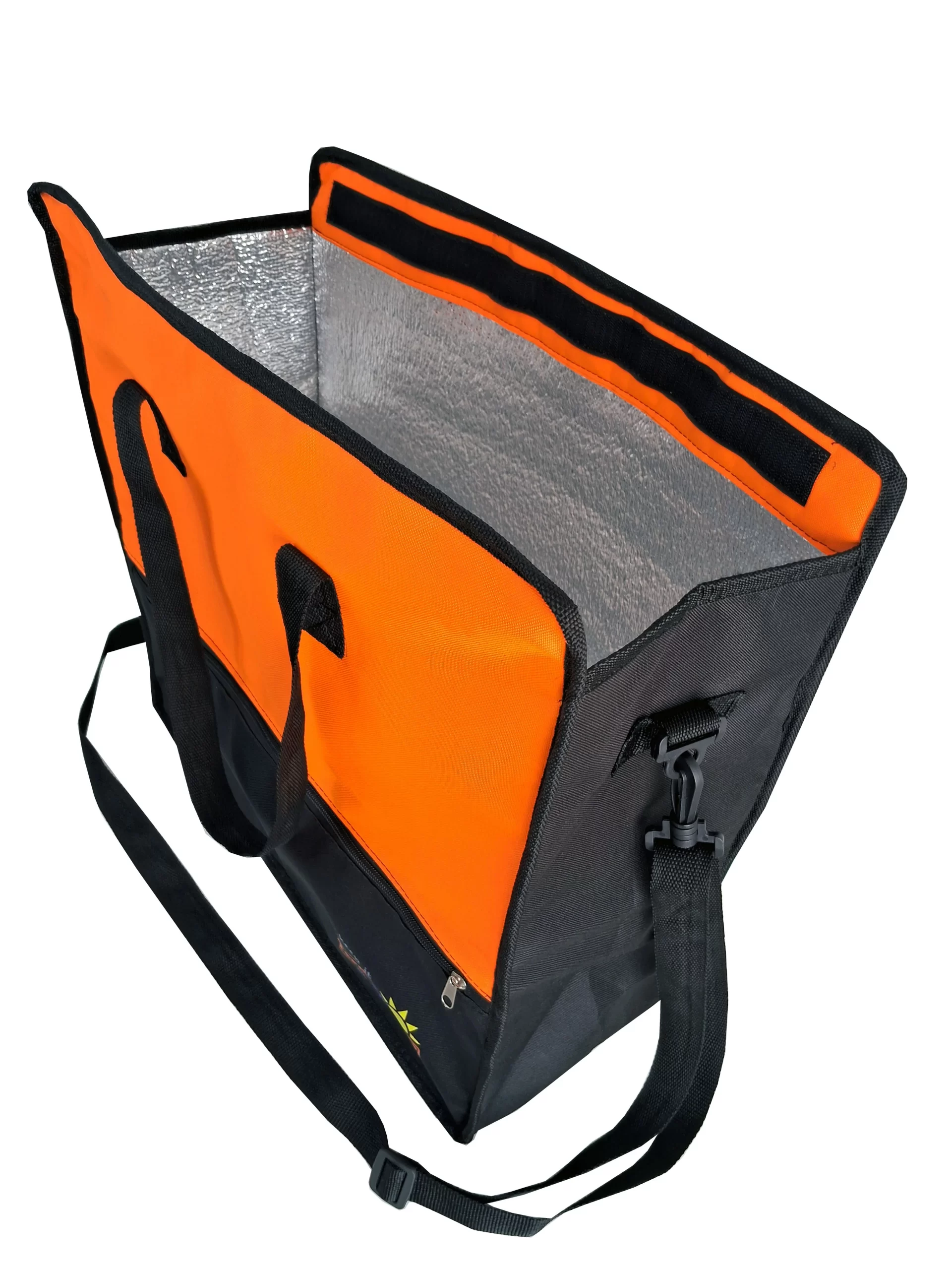Bolsa conservadora térmica XL para compras o salidas al aire libre, medidas 50 x 20 x 50 cm. bolsillo con cierre frontal, cerrado superior con Velcro, manijas superiores y correa extraíble y regulable para uso como morral, interior en material térmico aluminizado de 5 mm de grosor.